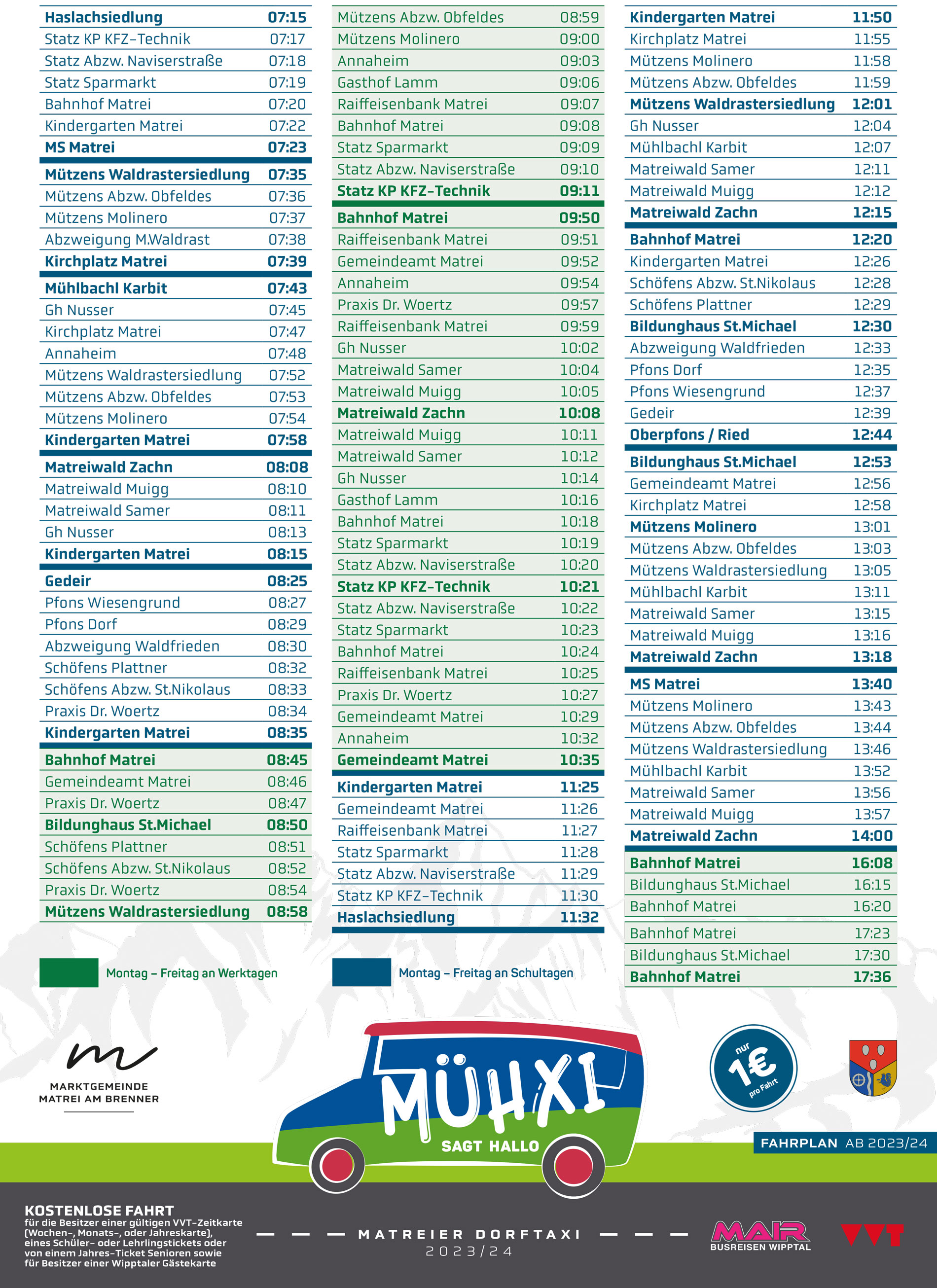 Der MÜHXI Dorfbus von Busreisen Wipptal Mair bringt Sie sicher und pünktlich ans Ziel. Nutzen Sie unseren aktuellen Fahrplan, um Ihren Transferbedarf bequem zu planen. Unser Service steht für Verlässlichkeit und Komfort, damit Sie Ihre täglichen Wege stressfrei erledigen können. Informieren Sie sich jetzt über die Abfahrtszeiten und genießen Sie eine angenehme Fahrt mit dem MÜHXI Dorfbus – Ihre Verbindung innerhalb der Gemeindekooperation zwischen Matrei - Mühlbachl und Pfons.